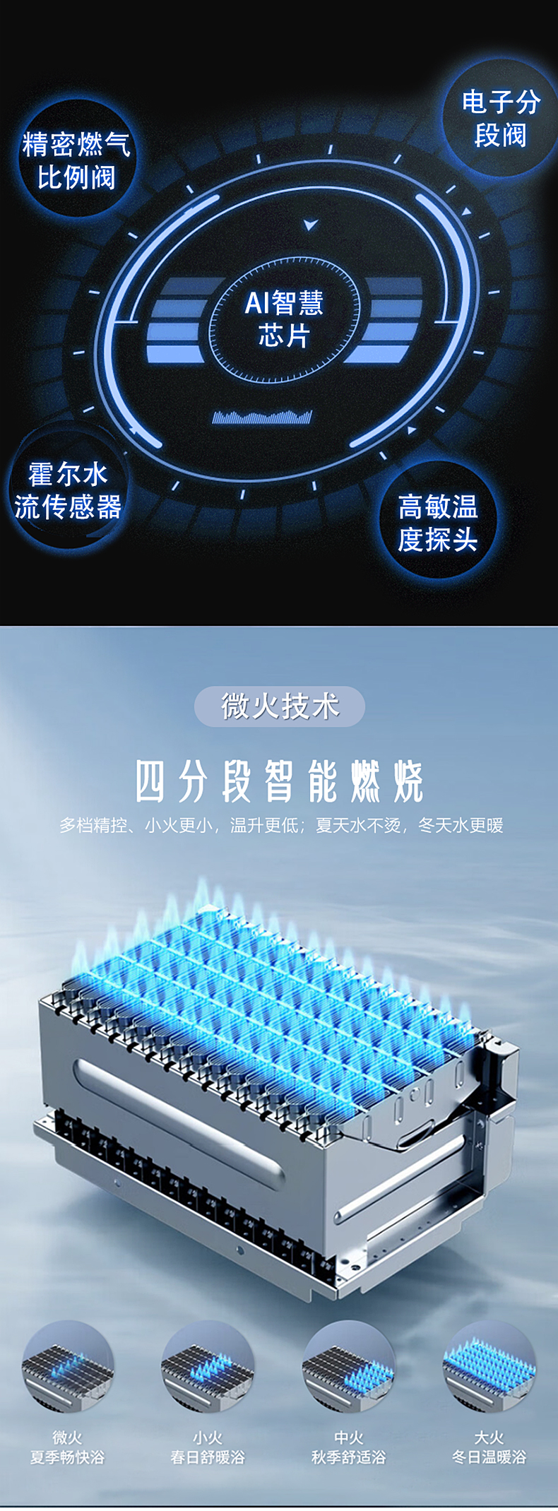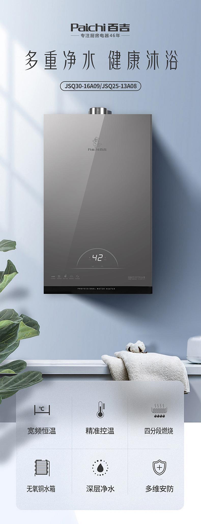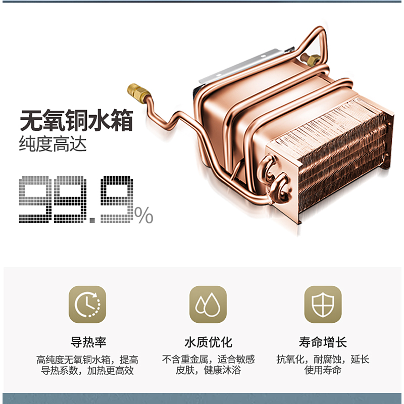 寬頻恒溫 精準控溫 四分段燃燒 無氧銅水箱 深層凈水 多維安防